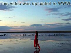 Mature woman strolls outdoors by Elton Salt Lake at red sunset with small tits exposed