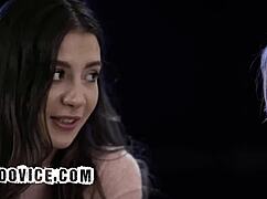 brunette babe slips into bed tempted by stepmom's tongue and stepdad's touch