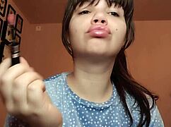 Close-Up Latina Femdom Slave Smokes with Glossy Big Lips Piercing Tongue