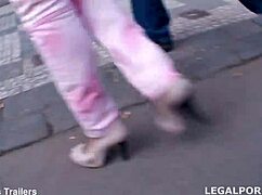 euro skank swallows jizz in a wild bukkake scene. her heels click as cumshots cover her face.
