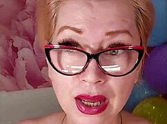 Mature bitch dildos juicy pussy amid colorful balloons