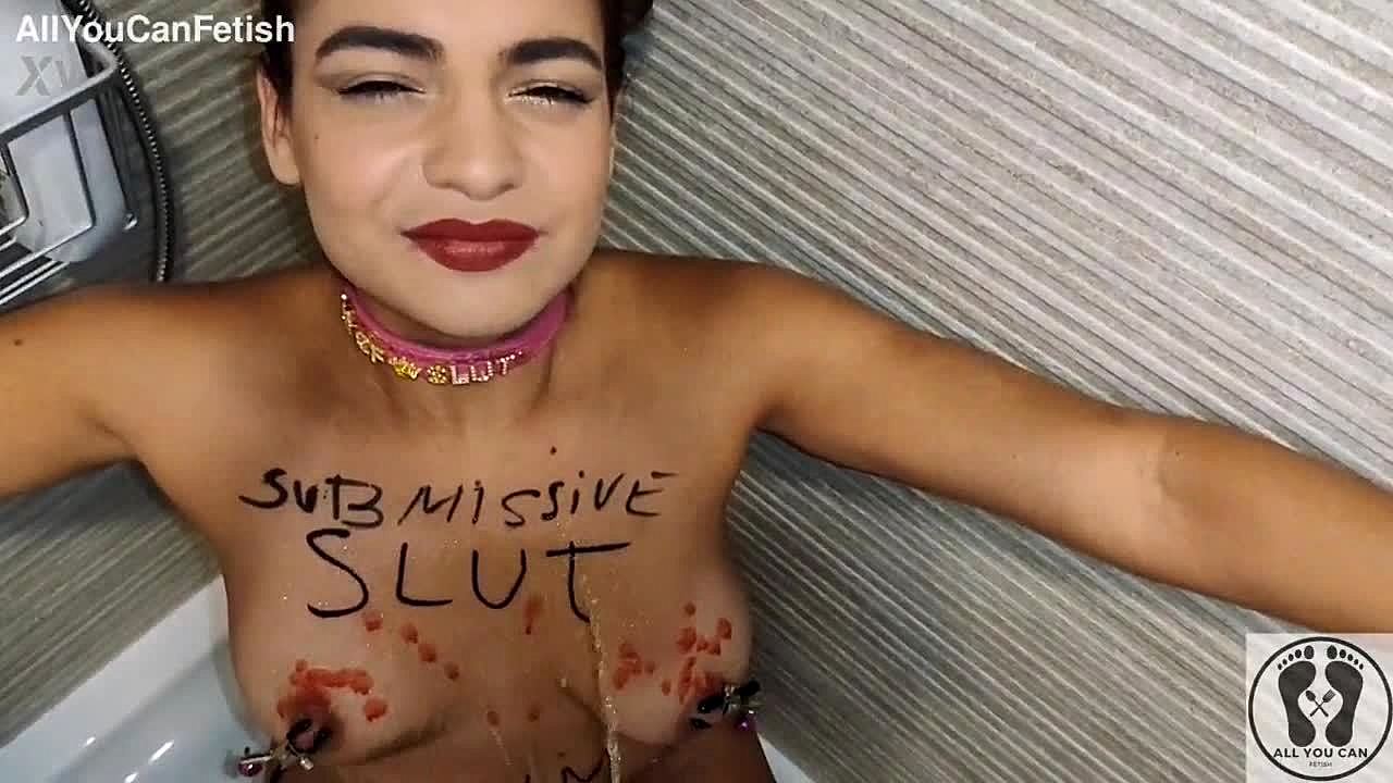 Watch This Self-Degrading Slut Devour Piss-Soaked Fruits with Body Writing!